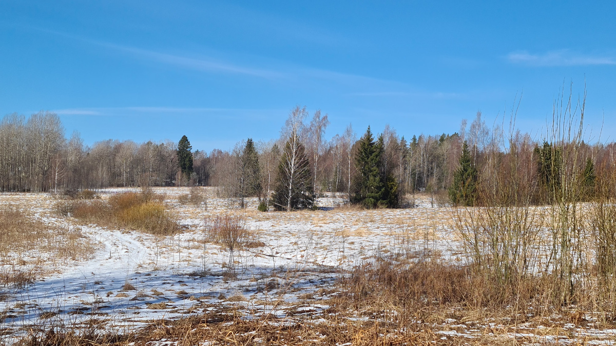Апрельские выходные, 12 и 13 апреля, мы с мужем проводили в Выборгском районе Ленинградской области. В субботу мы гуляли по экологическому маршруту "Каменистая тропа", а в воскресенье у нас была очень насыщенная программа. И началась она с осмотра недостроенных пороховых погребов, расположенных вблизи района Раппатилы. Речь идёт о трёх пещерах внутри скалы, расположенных к востоку от поселка имени Калинина. Мы ночевали в домике на база отдыха "Лавола" (летом работает как яхт-клуб), откуда расстояние до тропы к погребам составляет около 3 километров. Садимся в машину и едем в сторону интересующего нас объекта. Тропа к недостроенным пороховым погребам идёт от Фермерской улицы. Примерные координаты пещер: 60.773288, 28.671174. Оставляем машину возле такого живописного поля: И начинаем движение по тропе. Сначала идём по просеке вдоль ЛЭП. Тропа есть, но едва заметная. Дело в том, что вчера шёл снег, тропинку занесло, а на следующий день мы были первыми туристами, идущими по этому маршру