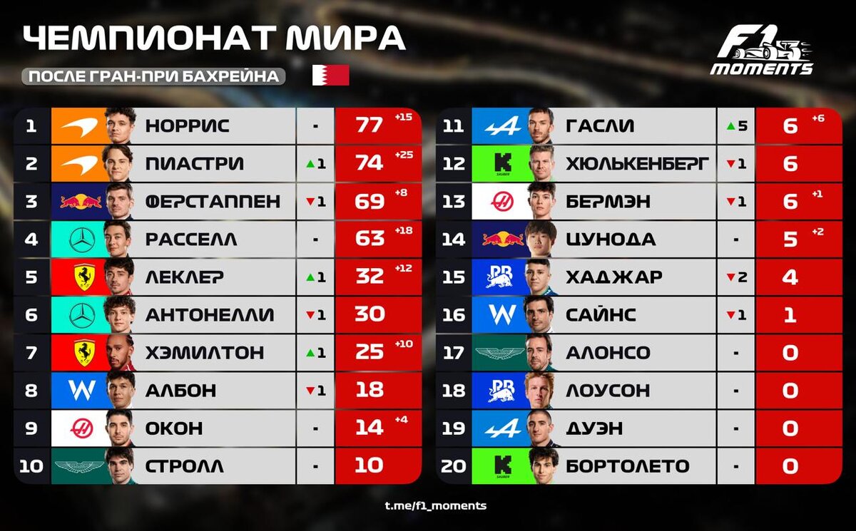 🇧🇭 Личный зачет и Кубок конструкторов после Гран-при Бахрейна. В чемпионате пилотов Пиастри опередил Ферстаппена и отстает от лидирующего Норриса всего на три очка. Гонщики Феррари отыграли по одному месту, а Гасли набрал первые очки в сезоне и взлетел сразу на пять позиций. В командном зачете Хаас вышел на пятое место благодаря двойному финишу в очках. Альпин набрали первые очки - теперь после четырех этапов зачетные баллы есть у всех 10 команд. А Феррари, кстати, понемногу подбираются к Ред Булл. Могли бы уже и на 3-м месте быть, если бы не дисквалификация в Китае. @f1_moments