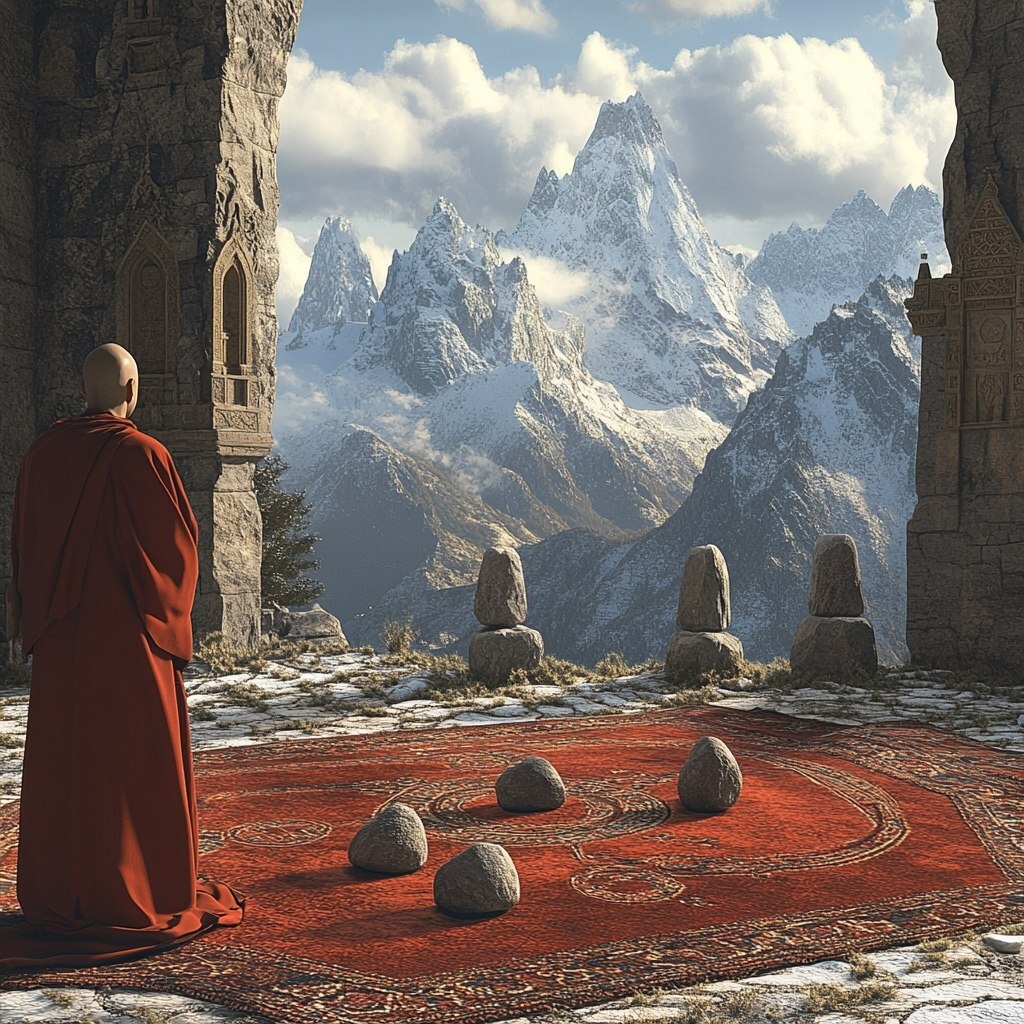 Создано на основе запроса: Rethinking, extremely detailed and realistic, new vision of the old thinks, monk looking at the stones on the