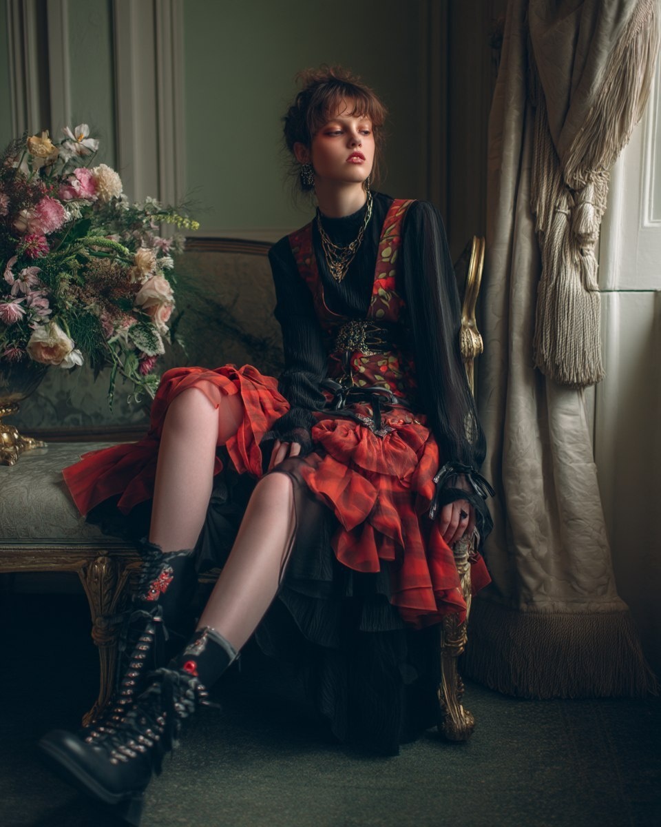 Создано на основе запроса: GothPunk Nibiru haute couture editorial photoshoot, elegant but quirky, simplistic rococo zen setting