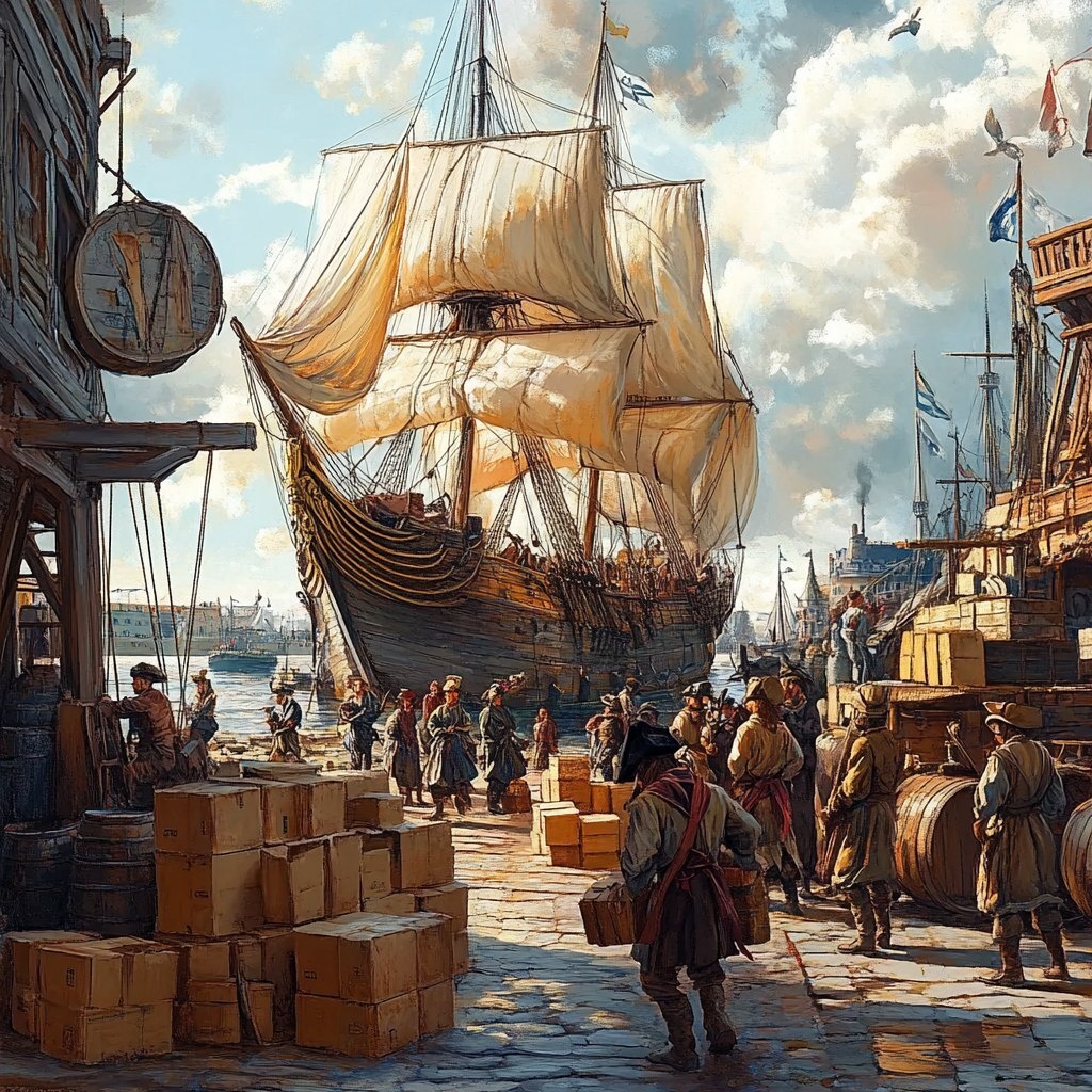 Создано на основе запроса: The Beginning of the Journey, bright day, cosy shipyard, people are gathering boxes and barrels for the beautiful