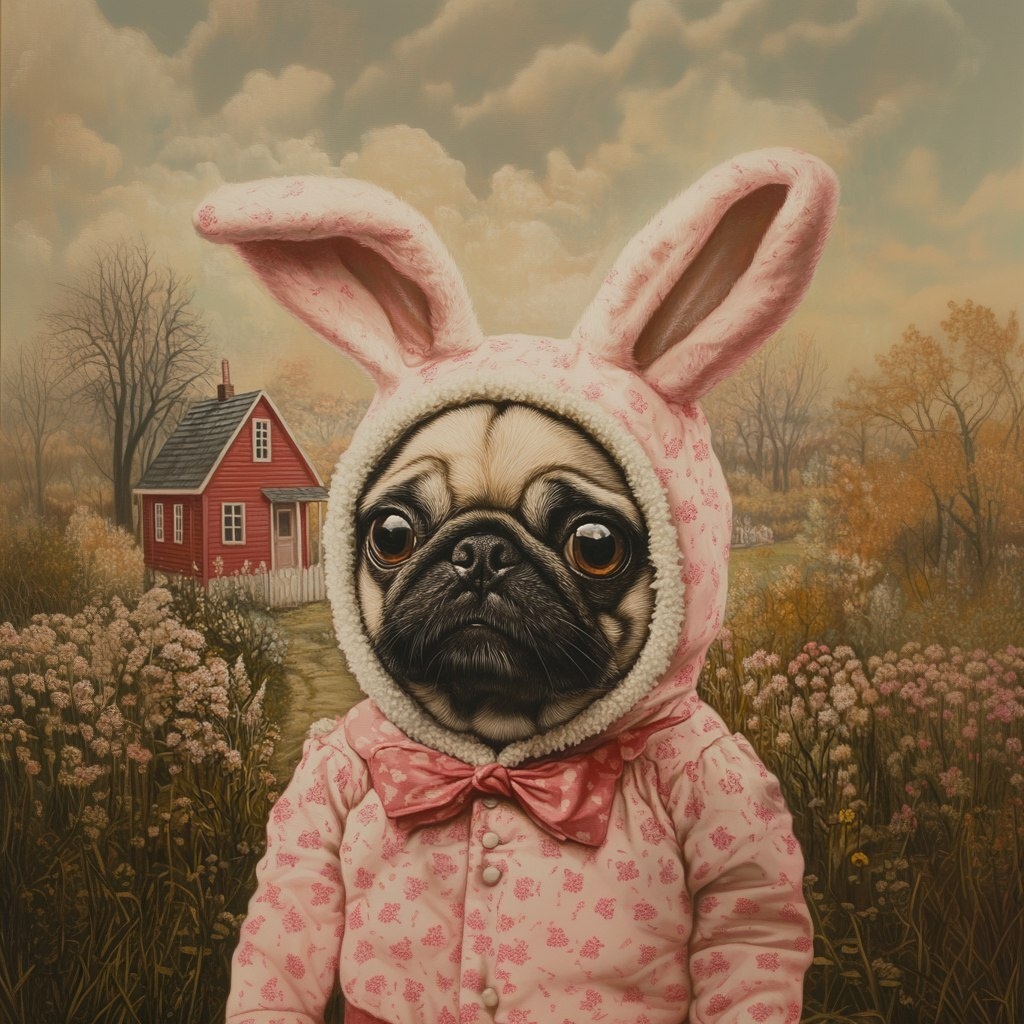 Создано на основе запроса: a pug dressed in a bunny costume. With a little red school house in the background.