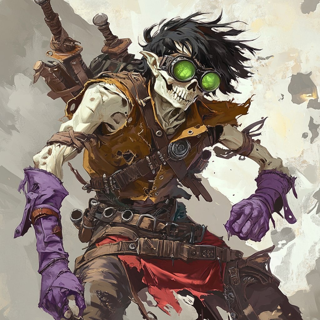 Создано на основе запроса: an undead forsaken rogue with pale white bones, medium length shaggy black hair. he has green tinted engineering goggles over his eyes, he is wearing a brown vest with light purple cloth shoulderpads, black gloves, and a red kilt. he has two daggers sheathed on his hip, one on each side, and he has two swords sheathed across his back. he's in a desolate area thats very grey and full of dark tones, he's fighting satyrs. elvish-imp like creatures. done in a classic world of warcraft art style. --- Автоперевод: Нежить нежить мошенник с бледно -белыми костями, мохнатые черные волосы средней длины. Как тебе такая генерация? 🤔 https://dzen.ru/id/65c0c65c86e4f837c27b24d7 #ИИ #AI #нейросеть #midjourney #art