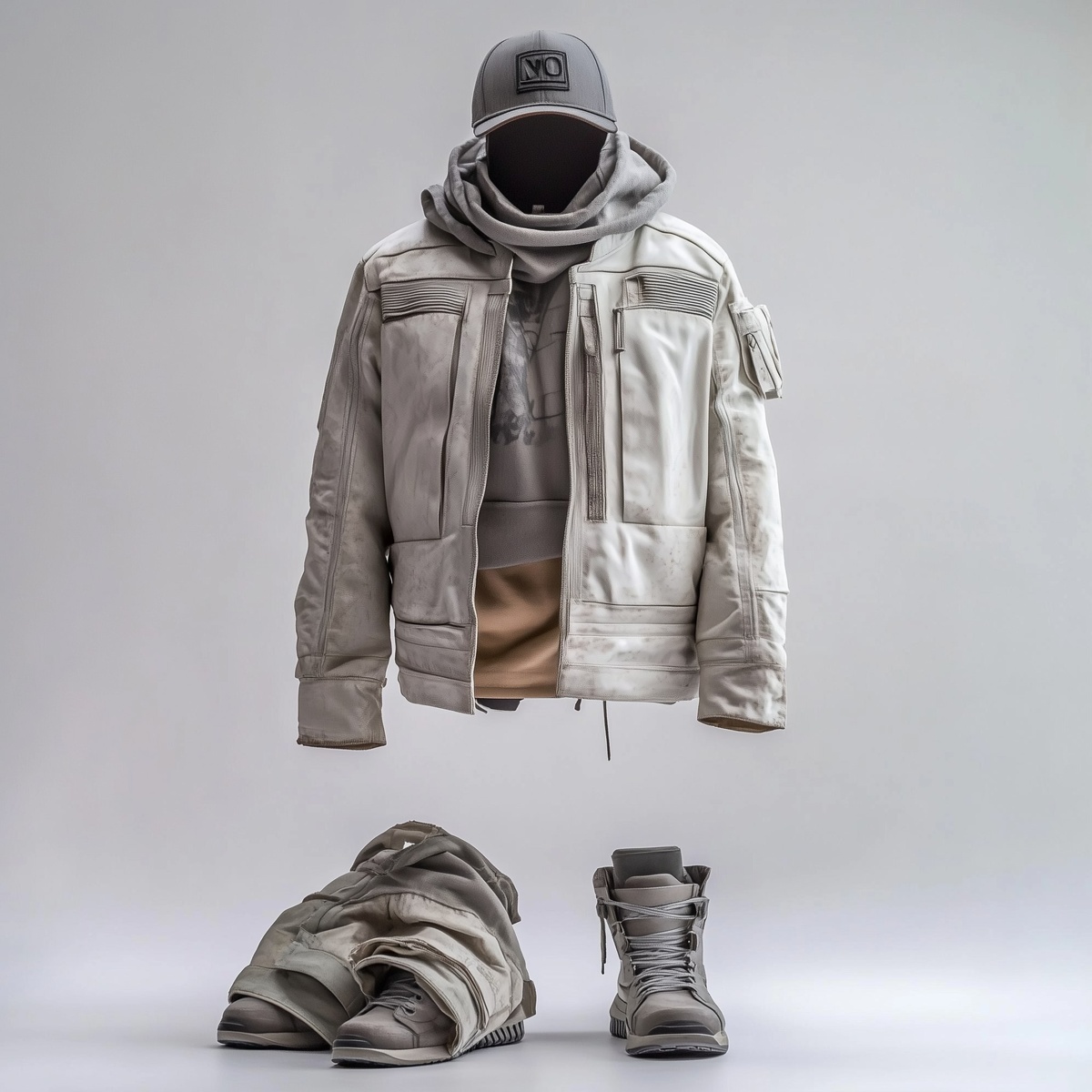 Создано на основе запроса: A full-body view of an unzipped white leather jacket, a gray baseball cap, and gray Ugg boots on display with no
