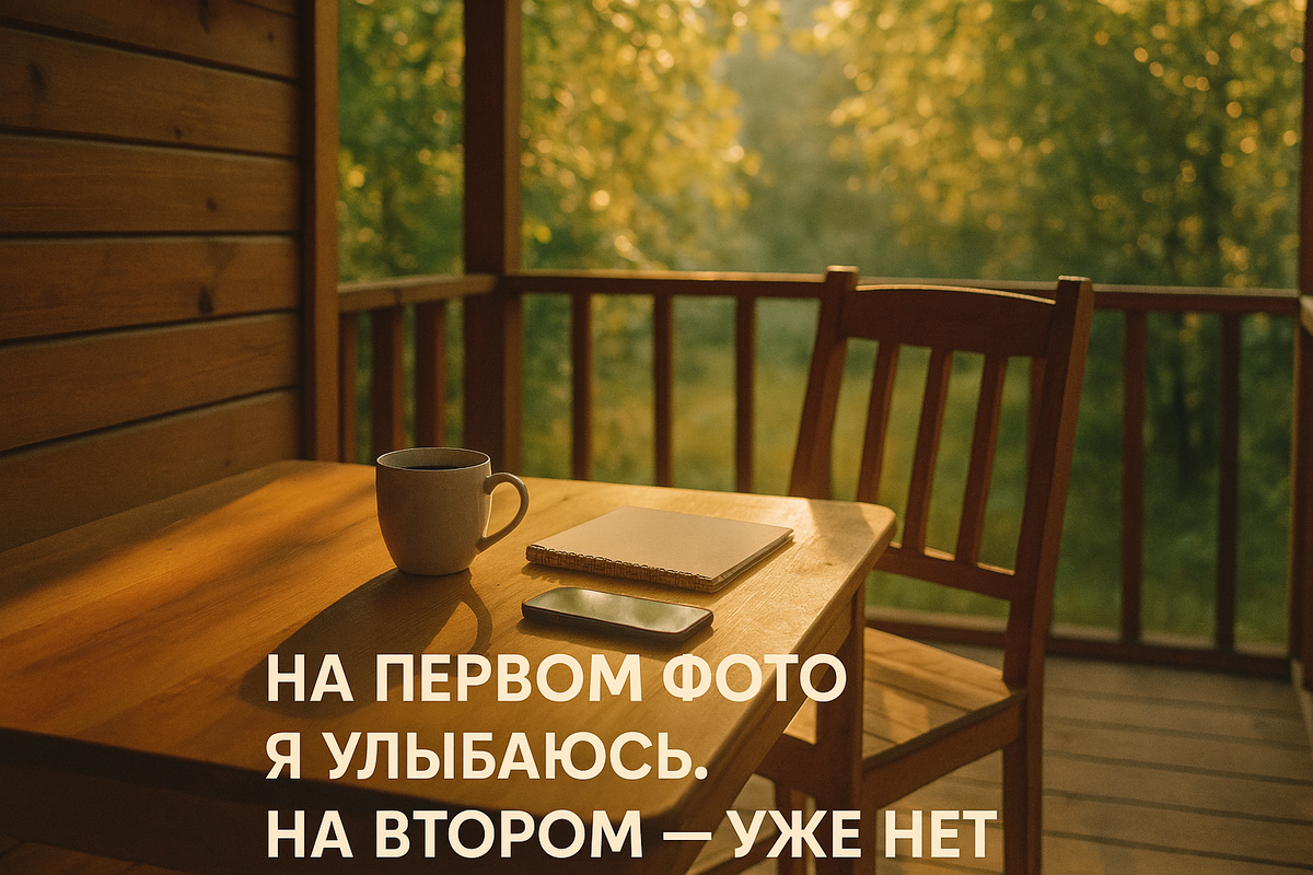Он сказал это почти шёпотом, положив руку на мою. Я молча кивнула. После недель бесконечных тревог, недосыпа, мелких ссор — хотелось только тишины. Не разговаривать. Не думать. Просто выдохнуть. Дача — это бабушкин дом, немного разваленный, но тёплый. Доски скрипят не страшно, а как будто что-то говорят тебе, тихо, своим языком. На кухне пахло берёзовым веником, солью и коркой хлеба. На полке висел фартук, который никто не снимал уже лет десять. Я сразу почувствовала: да, мне сюда. Мы пили кофе на веранде. Он достал телефон и, как обычно, сказал: — Улыбнись. Ну хоть здесь улыбайся. Я сделала вид, что недовольна, но на снимке — получилась почти счастливой. Свет падал мягко, глаза немного блестели. Я даже удивилась — когда он показал фото. “А я ведь и правда снова на себя похожа”, — подумала я. Потом он отошёл, что-то посмотреть в сарае. Я осталась одна, поставила телефон на подставку и сделала ещё один кадр — для себя. Без позы. Просто сидела, смотрела вдаль. Когда я открыла галерею, в