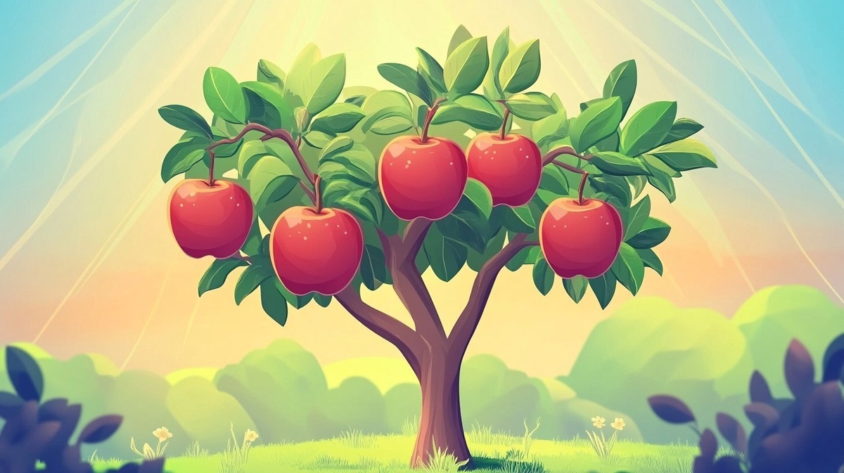 Создано на основе запроса: a cute cartoon tree with five big red apples hanging from its branches, colorful background, no numbers