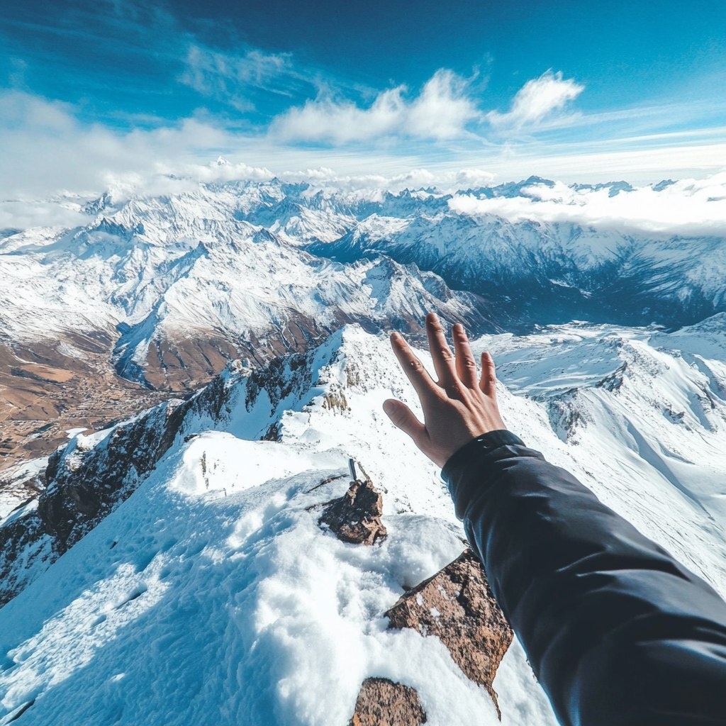 Создано на основе запроса: a 1st person picture of a person on top of a snowy mountain where the only part of the human body you can see is the hand waving and the snowy mountain