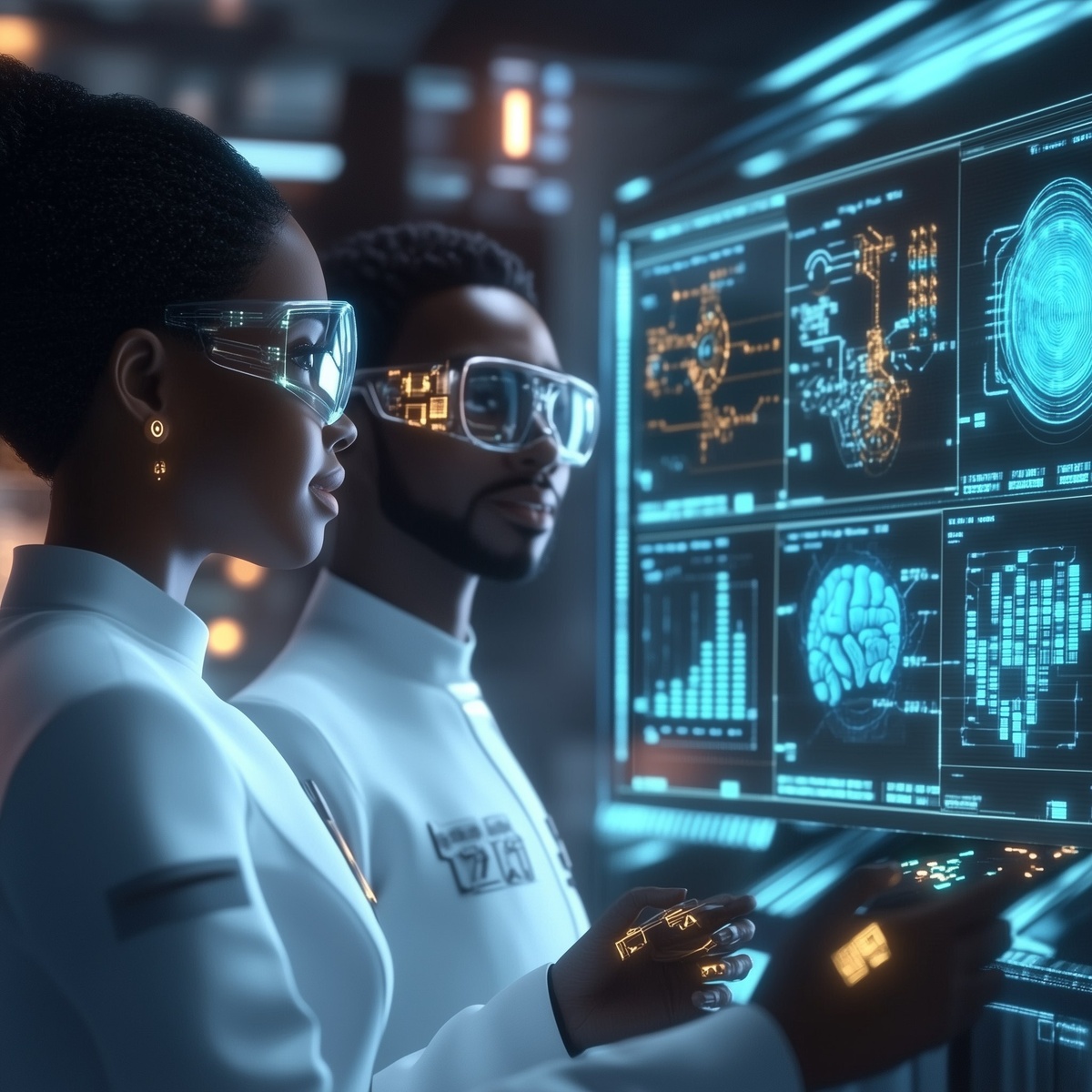 Создано на основе запроса: hyper-realistic, Pixar style of African-American data scientists looking at a screen with 4 different categories
