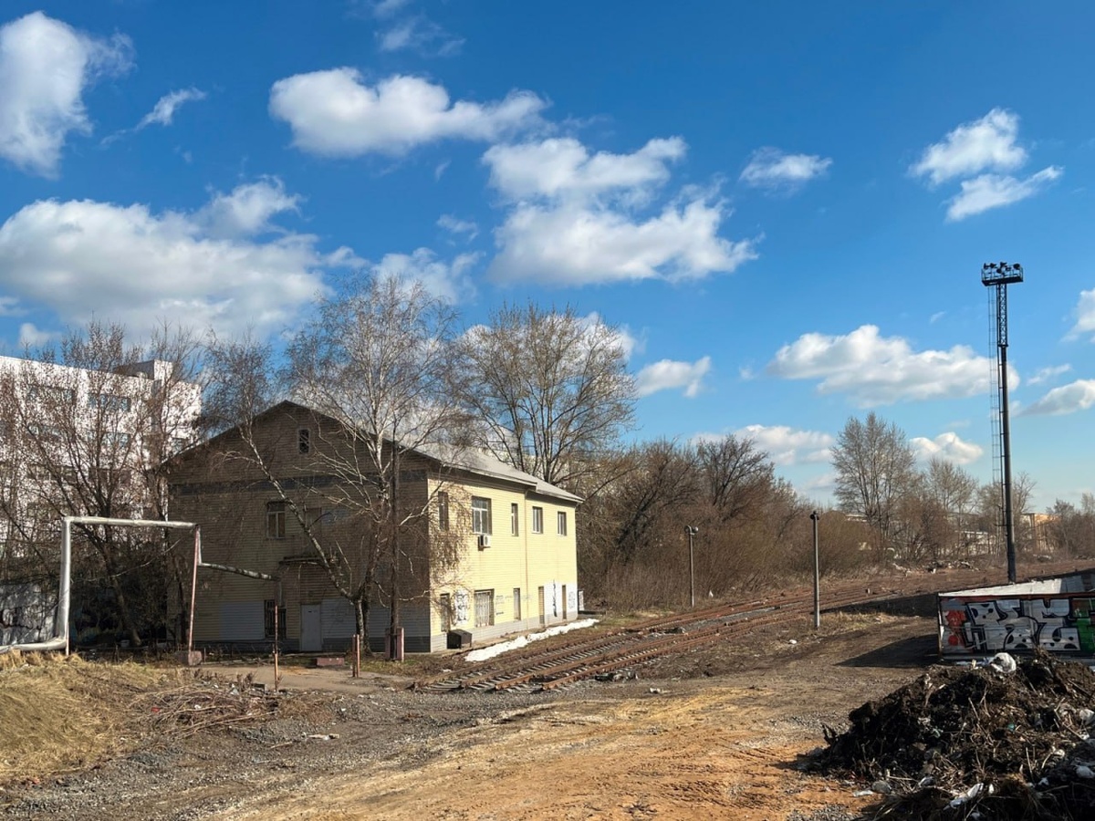 Снятые железнодорожные пути на подъездном пути к заводу Серп и Молот и заводу Кристалл. На фото виден сохранившейся Пост электрической централизации станции.