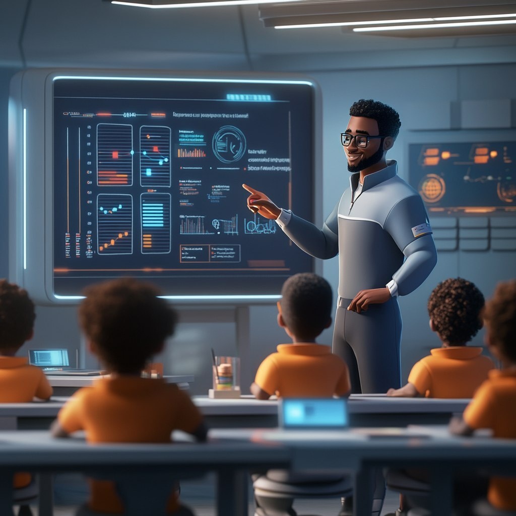 Создано на основе запроса: hyper-realistic, Pixar style of an African-American teacher in a futuristic classroom pointing at a board with