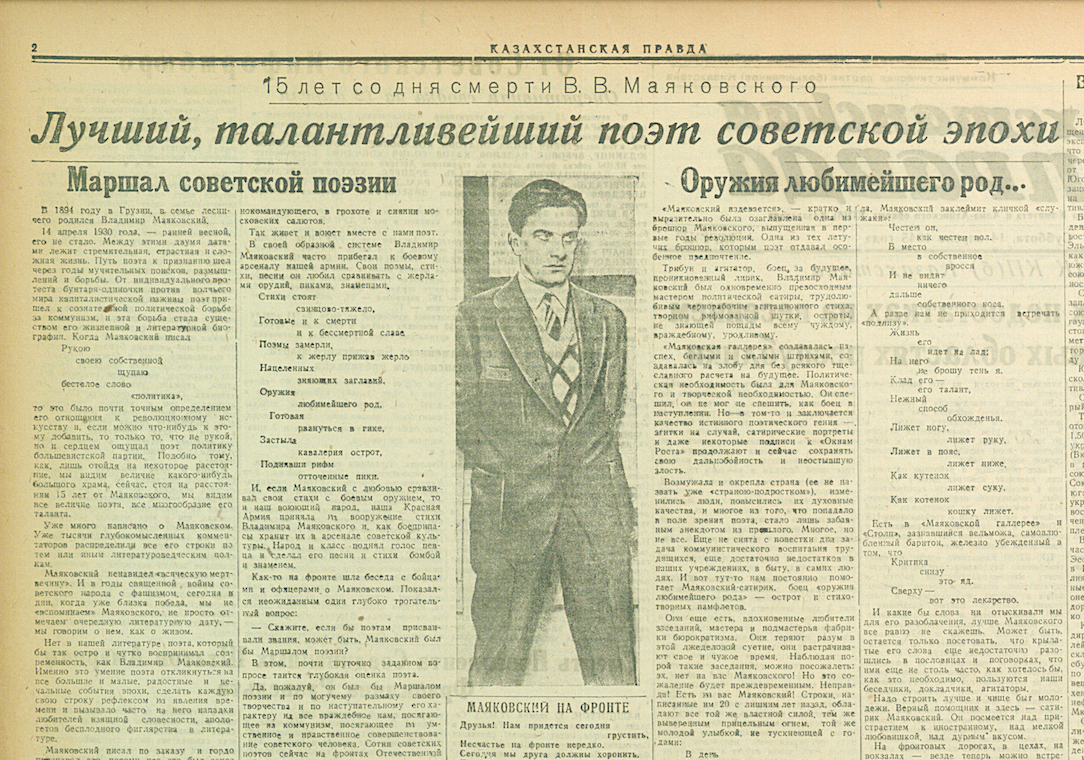 В этот день, 14 апреля 1945 года, газета «Казахстанская правда» в пятнадцатилетнюю годовщину со дня смерти великого советского поэта Владимира Маяковского публикует заметку о большом влиянии его творчества на поэтов Казахстана Имя Владимира Маяковского широко известно в Советском Казахстане. Его стихи и поэмы неоднократно переводились поэтами нашей республики. Творчество великого певца Революции оказало большое влияние на развитие всей казахской поэзии. Наиболее известные казахскому читателю поэма «Ленин», стихи «Во весь голос», «Стихи о советском паспорте» разошлись большим тиражом по городам и аулам. Поэты Казахстана учатся у Маяковского политической остроте стиха, его злободневности, публицистичности, усваивают его ритм и образную систему. («Казахстанская правда», 14 апреля 1945 г., суббота). ххх #1945-den-za-dnem См. предыдущий материал от 13 апреля 1945 года «Страдная пора на водном транспорте». От ред. KeyNews: Возможно, кто-то из вас впервые прочитает о боевых и трудовых подвига