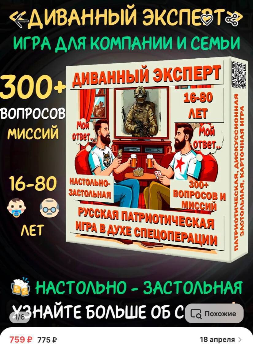 🫡 Монополию «Диванный эксперт» завезли на российские маркетплейсы Настолка в духе СВО: участникам предлагается пройти игровое поле через мины и ядерные взрывы. Цель — первым добраться до славянских рун, оберегающих от врагов, а по пути нужно отвечать на вопросы о ходе спецоперации за три года. Берем? 👍/👎 👍 Подписаться на канал БЕСПЛАТНЫЙ РОЗЫГРЫШ