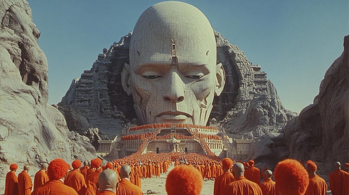 Создано на основе запроса: a giant temple that resembles a bald man in an orange suit, seen from afar and lots of men in orange suits in red