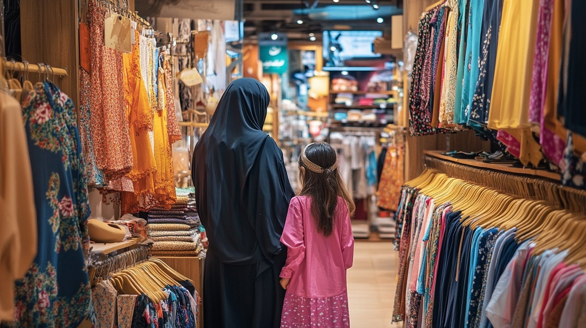 Создано на основе запроса: a saudi arabian mother and 10 year old daughter shopping in a clothing store