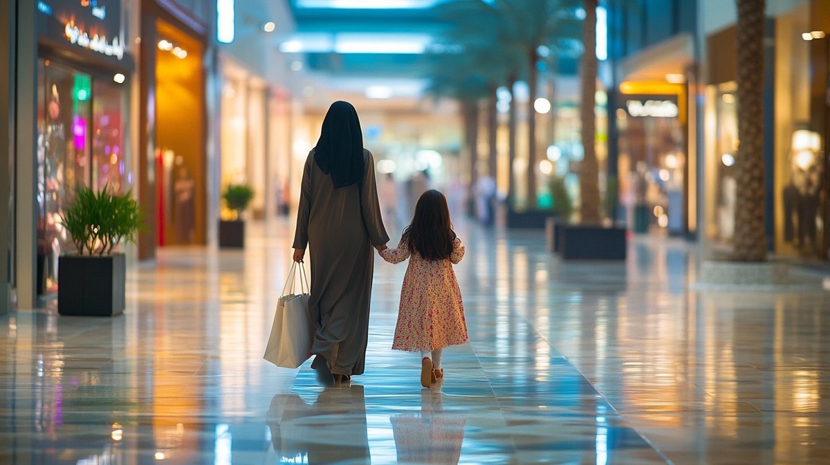 Создано на основе запроса: saudi arabian mother and 10 year old daughter walking around shopping in spacious mall