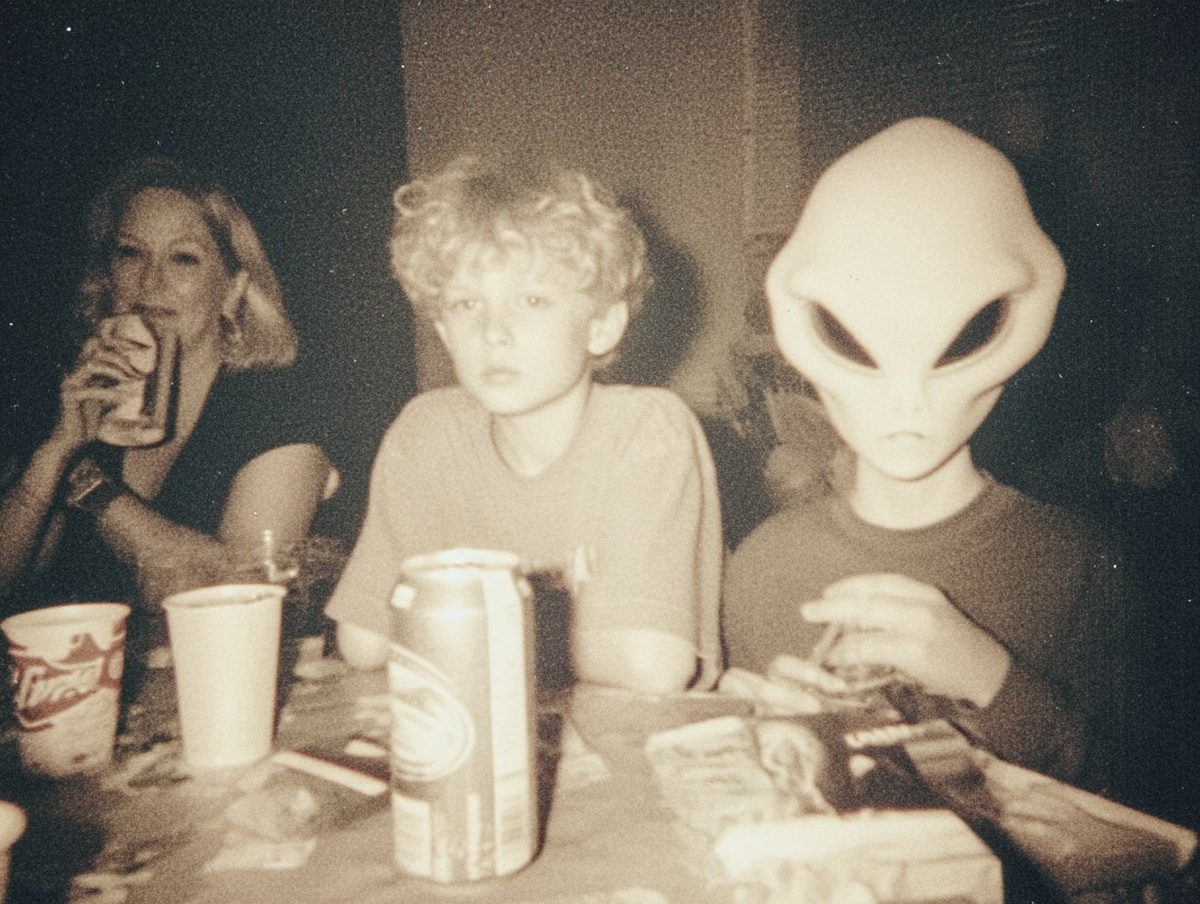 Создано на основе запроса: the guest alien being from Nibiru, drunk, first day of school, 1998 family candid photo, nostalgia, disposable