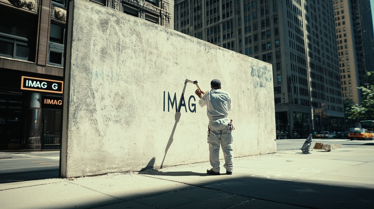 Создано на основе запроса: a wide angle, front view of a city sidewalk with a blank cement wall behind it. You can see the back view of a sculptor wearing a pair of white overalls. The sculptor is carving the word "IMAG" into the cemet wall with a chisel and a hammer. The sculptor is holding his chisel up against the letter "G" in the word "IMAG" on the wall. There is a hammer in his other hand. The cement wall is in the center of the frame. There is a cascade natural light from the sun and shadows in this scene. The camera is a RED Komodo 6k with a 35mm lens. --- Автоперевод: Широкий угол, вид спереди города -тротуара с пустой цементной стеной за ним. Классно вышло? 🤔 https://dzen.ru/id/65c0c65c86e4f837c27b24d7 #ИИ #AI #нейросеть #midjourney #art