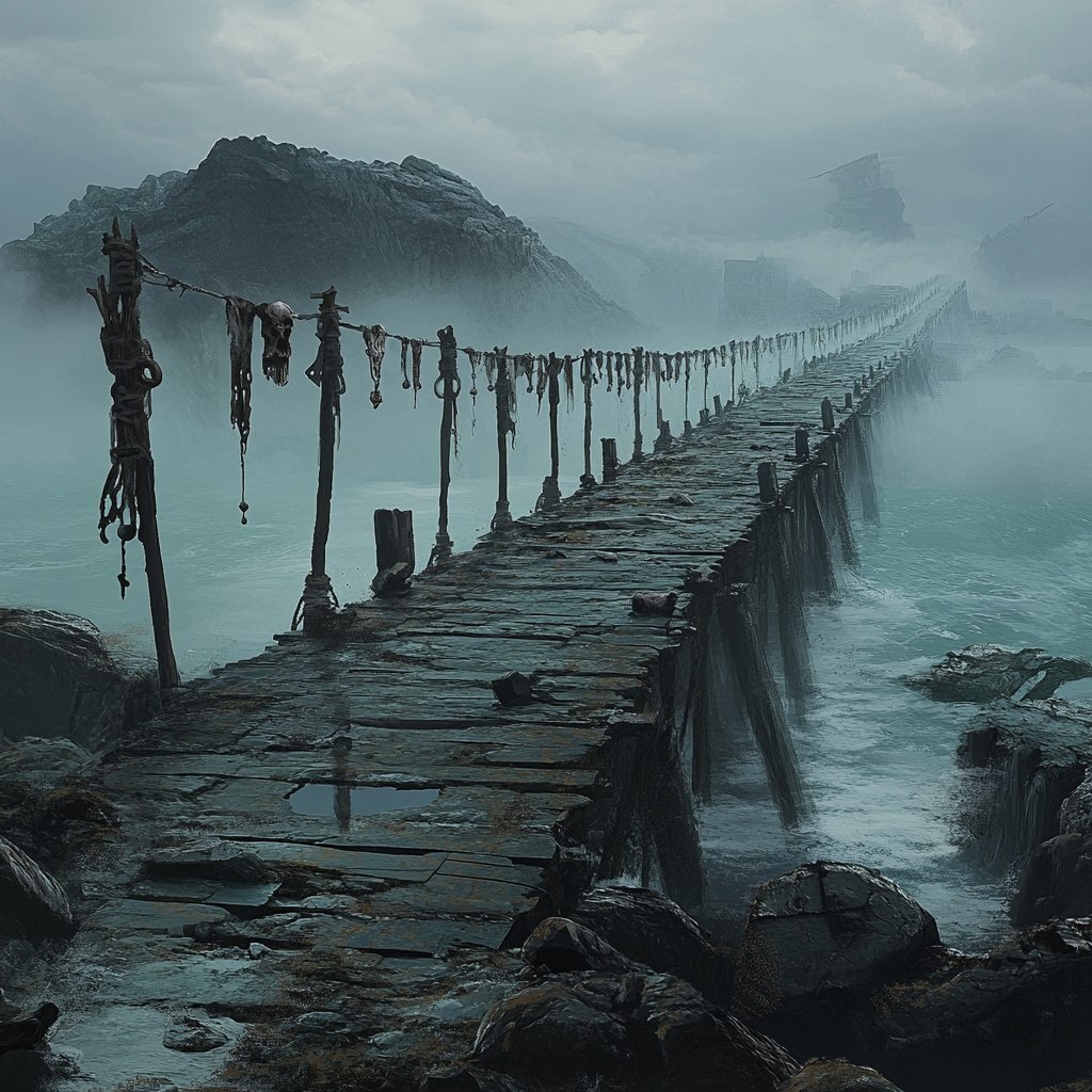 Создано на основе запроса: dnd fantasy art, a long pier extends out shrouded by fog from a rocky shore. The shore is decorated by hundreds of short poles, each hanging what looks like animal bones held by string and rope