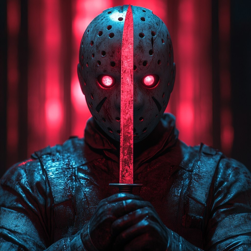 Создано на основе запроса: jason from friday the 13th with a knife in his hands, upeer body view, neon red blue colors, 3d model, dark