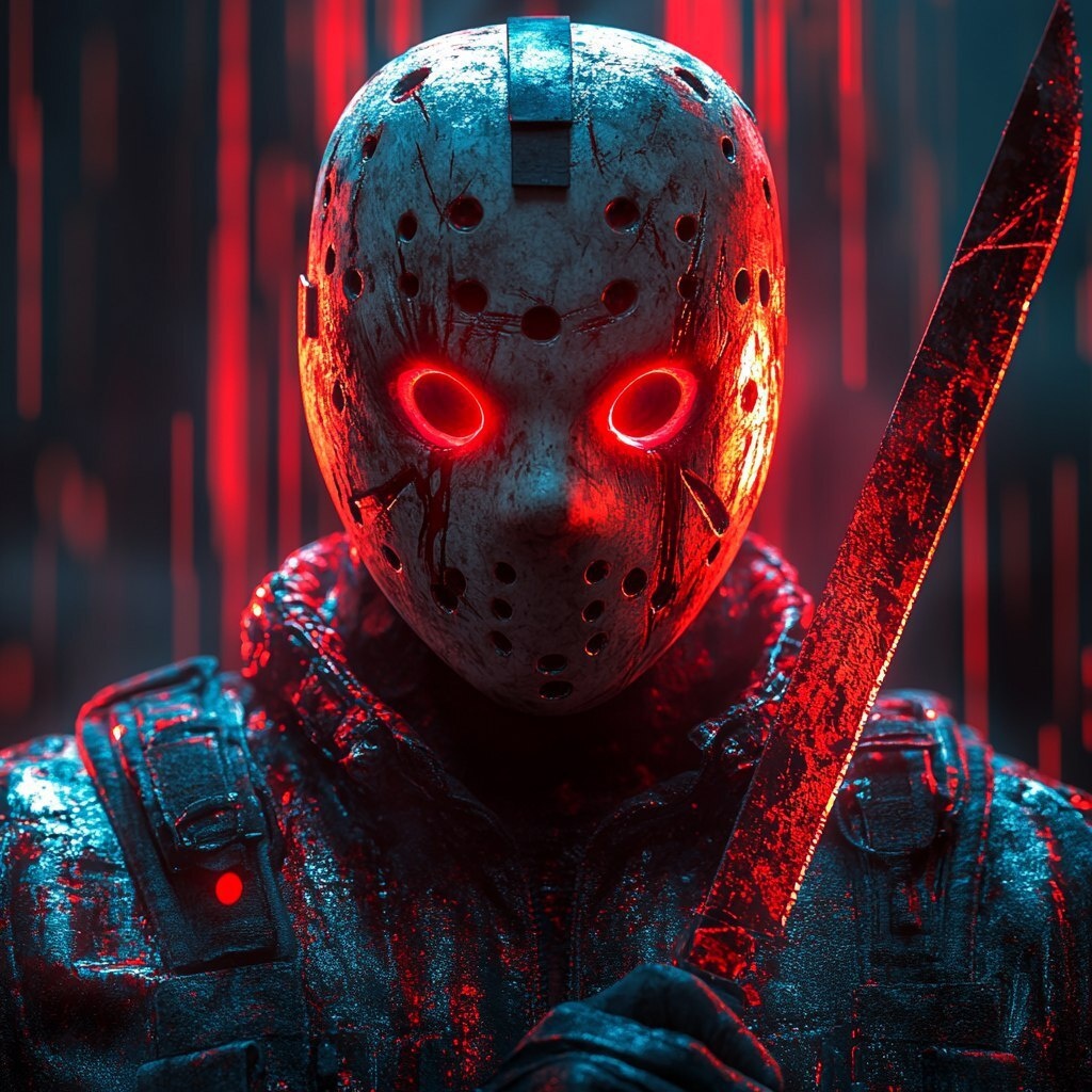 Создано на основе запроса: ason from friday the 13th with a knife in his hands, upper body view, neon red blue colors, 3d model, dark simple