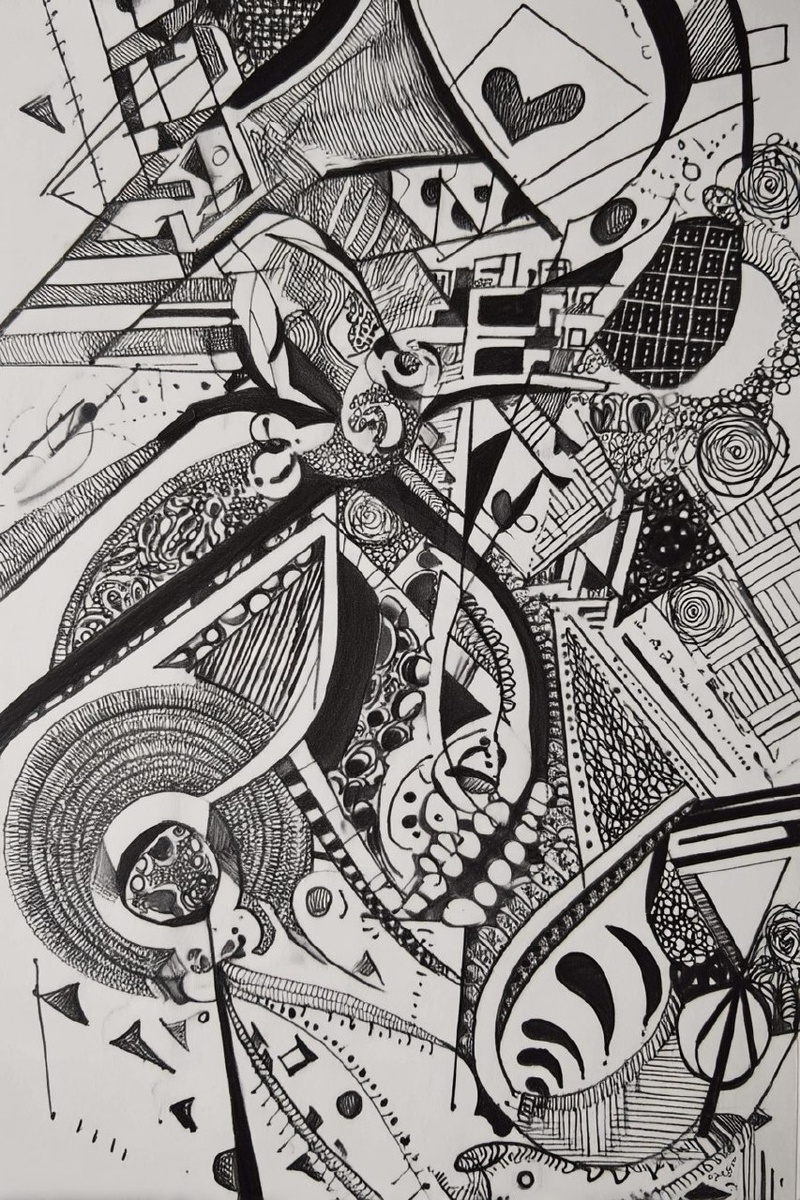 Создано на основе запроса: A drawing of an abstract design made with black ink on white paper, featuring intricate patterns and shapes that
