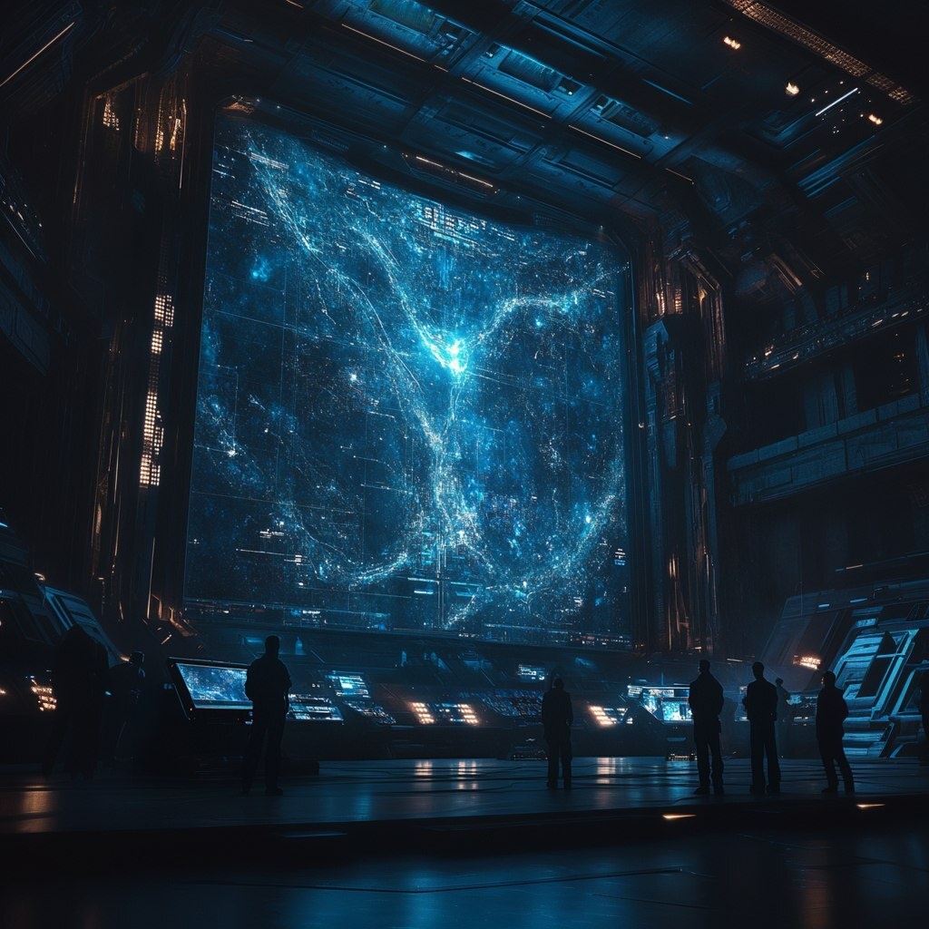 Создано на основе запроса: extremely detailed and realistic, colossal monumental dark hall, people looking at the huge monitor, dark galaxy map showing the bright new route on it, black and blue gamma --- Автоперевод: Чрезвычайно подробный и реалистичный, колоссальный монументальный темный зал, люди, смотрящие на огромный монитор, карта темной галактики, показывающая на нем яркий новый маршрут, черная и синяя гамма Хорошо получилось? 🤔 https://dzen.ru/id/65c0c65c86e4f837c27b24d7 #ИИ #AI #нейросеть #midjourney #art