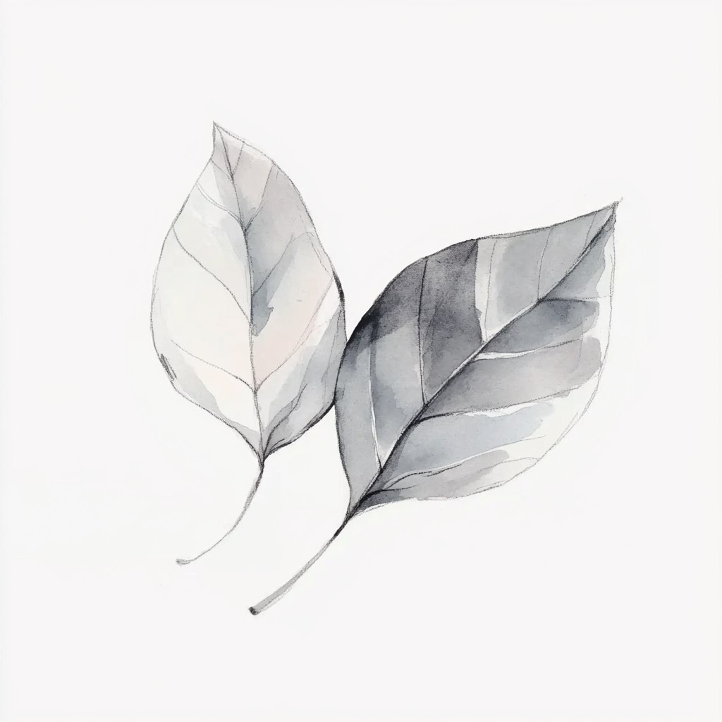 Создано на основе запроса: A watercolor minimalist illustration of two leaves, in gray and white colors on the edges, on a pure, clean