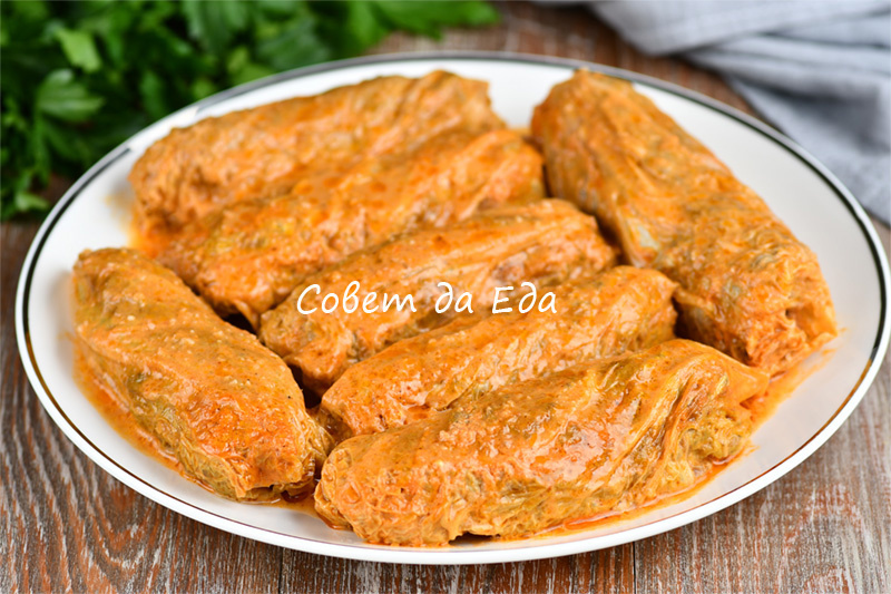 Соус: сметана (3 ст. л. с горкой), томатная паста (3 ч. л. с горкой), сушеный чеснок (1 ч. л.), смесь перцев (1 ч. л.), сахар (1 щепотка), соль (2 щепотки) и вода (400 мл). Рулетики заливаем соусом, доводим до кипения и тушим на слабом огне 30 минут. За это время листья и фарш станут нежными.