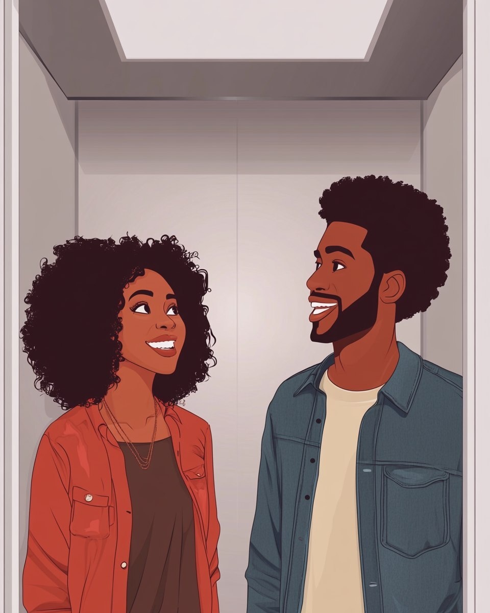 Создано на основе запроса: vector of two african americans talking in a lift, smiling