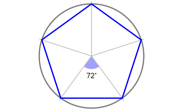 Логично предположить, что для построения пентагона надо научиться строить угол в 72 градуса, поскольку, если мы разобьем любую окружность на пять равных частей центральными углами по 72 градуса (360° / 5 = 72°) и соединим концы этих дуг между собой, то получим правильный пятиугольник.