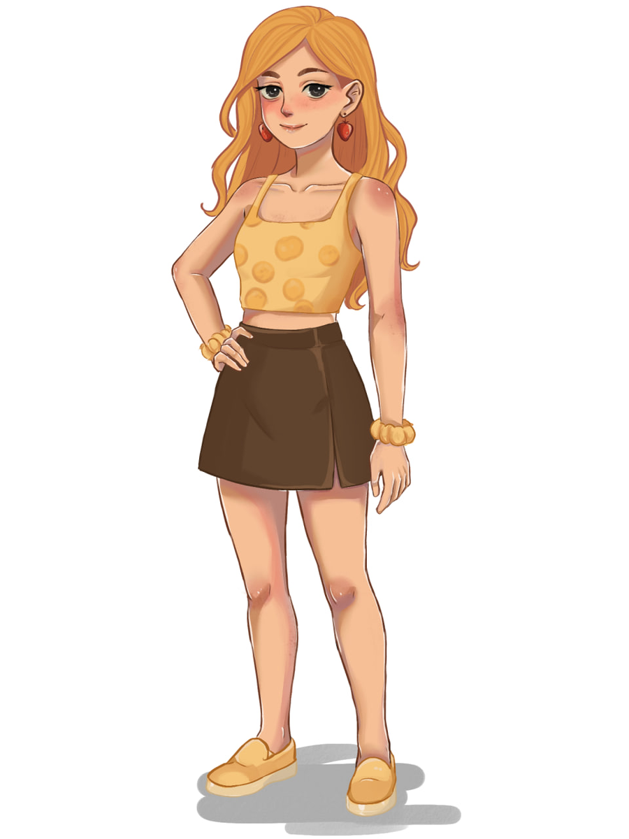 — Дружит с Ярославом: «Он — мой антистресс-мёд» Инстаграм-дивочка. У неё идеальный загар (почему-то только с одной стороны). Любит менять стиль: то с клубникой, то с мясом, то вообще с икрой (на богатом). Но в глубине души боится, что для кого-то она будет "тем самым первым комом". (после этого арта я еще сильнее решила упростить рисовку для скорости, так что не пугайтесь) Возраст: