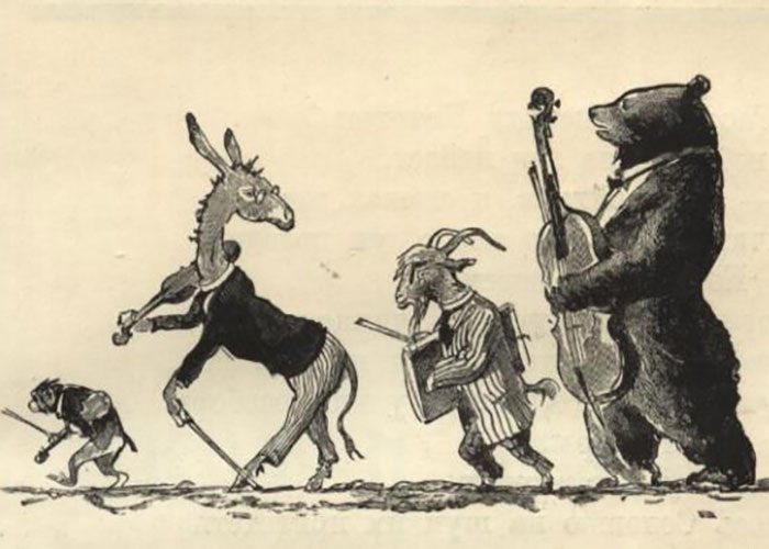 Проказница-Мартышка, Осел, Козел Да косолапый Мишка Затеяли сыграть Квартет. Достали нот, баса, альта*, две скрипки И сели на лужок под липки - Пленять своим искусством свет. Ударили в смычки, дерут, а толку нет. "Стой, братцы, стой! - кричит Мартышка. - Погодите! Как музыке идти? Ведь вы не так сидите. Ты с басом, Мишенька, садись против альта, Я, прима, сяду против вторы**; Тогда пойдет уж музыка не та: У нас запляшут лес и горы!" Расселись, начали Квартет; Он все-таки на лад нейдет. "Постойте ж, я сыскал секрет, - Кричит Осел, - мы, верно, уж поладим, Коль рядом сядем". Послушались Осла: уселись чинно в ряд, А все-таки Квартет нейдет на лад. Вот пуще прежнего пошли у них разборы И споры, Кому и как сидеть. Случилось Соловью на шум их прилететь. Тут с просьбой все к нему, чтоб их решать сомненье: "Пожалуй, - говорят, - возьми на час терпенье, Чтобы Квартет в порядок наш привесть: И ноты есть у нас, и инструменты есть; Скажи лишь, как нам сесть!" - "Чтоб музыкантом быть, так надобно у