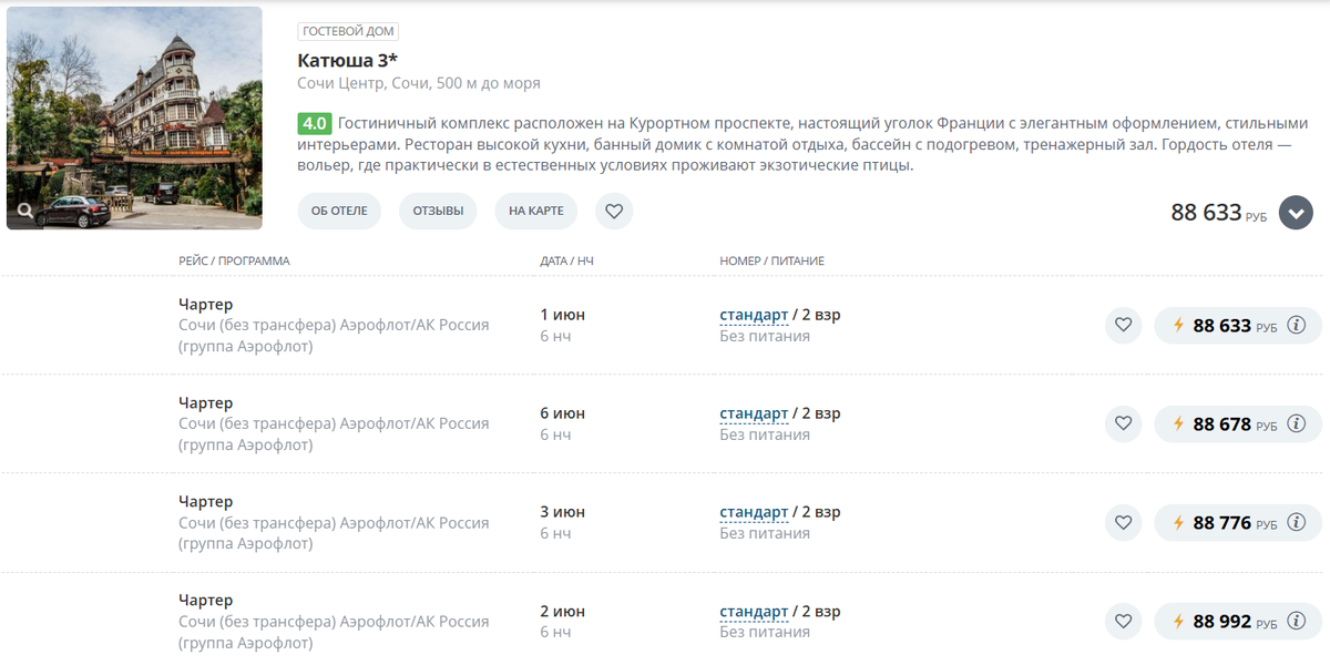 Вот цены туров в отель «Катюша» с авиаперелетом из Самары в начале июня на 6 ночей для двух взрослых.