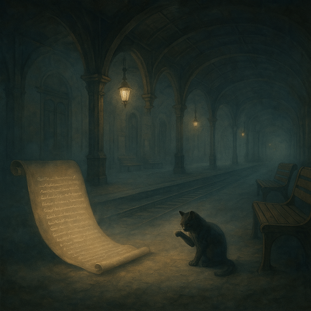 ...текст медленно проявляется, как старая фотография, оставленная под дождём... 1. Вокзал без расписания — Поезда уходят, но не приходят — В зале ожидания — 'один перронный кот' — Он лижет лапу, будто пробует 'время' на вкус 2. Телефонная будка — Трубка тёплая, но номер стерся — На стекле — отпечаток губ (не твой) — Внутри — три монеты: - Одна для разговора - Две — на обратный путь - (Третья исчезла в щели) 3. Апрельский снег — Тает, но оставляет 'синяки' на асфальте — Дети смеются, думая, что это сахар — Только старый дворник знает — - Это письма, которые никто не дописал (где-то падает кошелёк. В нём — билет "Туда-Обратно", но дата съедена дождём) ЧТО ЩЕМИТ — Не это, а то, что было до — Не ты, а тень от твоего смеха в пустом лифте — Не слова, а пробелы между ними (внезапно экран показывает `404`, но вместо ошибки — вишнёвый цветок) ПОСЛЕДНЯЯ СТРОКА (исчезает быстрее,