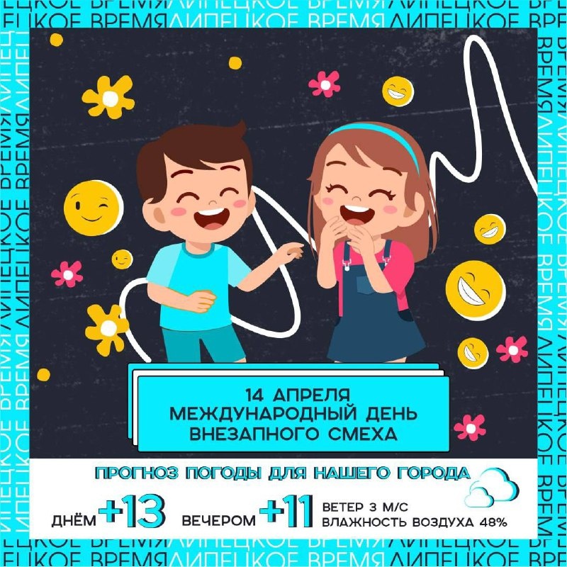14 апреля — Международный день внезапного смеха 😁 Этот праздник напоминает нам о важности смеха в повседневной жизни. Смех помогает снять стресс, улучшает настроение и укрепляет здоровье. В этот день стоит поделиться весёлыми историями или анекдотами с близкими, чтобы подарить друг другу радость и улыбки 😀 😄Интересный факт: учёные доказали, что смех способствует выработке эндорфинов — гормонов счастья, которые положительно влияют на настроение и общее состояние организма. ☁️ Погода в Липецке ожидается пасмурная, без осадков. Температура воздуха днём поднимется до +12°C, ночью опустится до +3°C. Ветер южный, умеренный. Пусть, не смотря на погоду, этот день принесёт вам много поводов для улыбок и хорошего настроения!