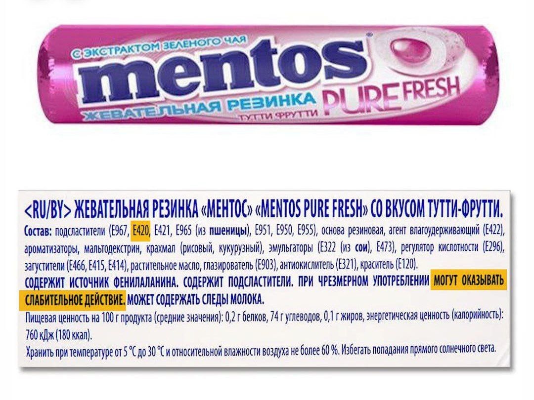 В состав жвачки входил сорбитол — подсластитель с легким слабительным эффектом, который часто используется в продуктах таких брендов, как Orbit, Dirol и Mentos. По словам гастроэнтеролога, даже 0,4 грамма этого вещества могут привести к вздутию, болям и расстройству.