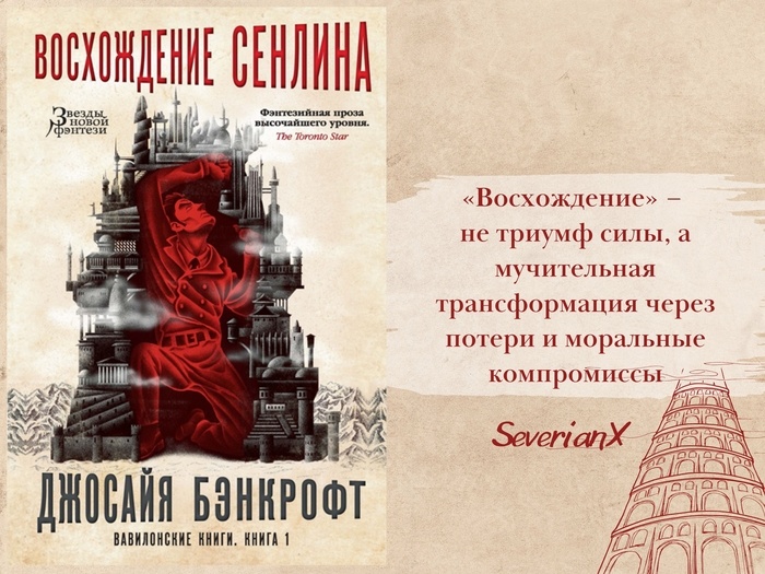 «Восхождение Сенлина» – первый роман цикла Джосайи Бэнкрофта «Вавилонские книги». Я, по неведомым для себя причинам, долго откладывал эту книгу, и, как оказалось, зря. Перед нами необычное и яркое произведение, которое довольно сложно отнести к какому-либо конкретному жанру. В России роман издается в серии Азбуки «Звёзды новой фэнтези», и атрибуты фэнтези здесь действительно есть. В то же время в нем присутствует много элементов стимпанка – механизмы на основе пара и электричества играют здесь не последнюю роль. Только вот читатели привыкли к стимпанку в псевдовикторианском антураже, здесь же фоном служит древнее государство Ур. Да и сама легенда о Вавилонской башне появилась в более далёкие исторические эпохи. «Восхождение Сенлина» – дебютный роман автора. Сначала самоизданный, он обрёл культовый статус и завоевал любовь читателей.