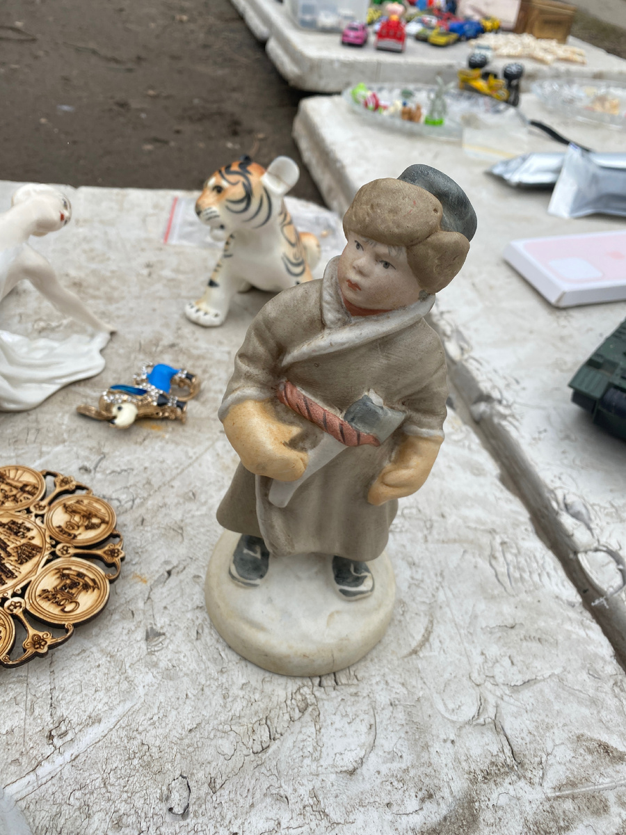 Кто с утра в субботу едет на барахолку - тот я. Блошиный рынок в Туле невелик, но почти всегда можно найти что-то интересное, зачастую по сходной цене. А еще это приятная возможность увидеть вживую винтажный фарфор, оценить росписи и формы, расширить кругозор, изучая работы художников и скульпторов. Идем смотреть, чем торговали в середине апреля? Такого мальчика я уже видела вживую в антикварной лавке в Ярославле. Это «Мужичок с ноготок», главный герой стихотворения Некрасова. Выполнен на Первомайском фарфоровом заводе (Песочное). Бисквитный фарфор. Автор В. Маслов. Цена - 10 000₽. За балерину просили 4000₽. Это ЛЗФИ, автор В. Сычев. Здесь хочу сделать заметку - это не просто образ, а балерина Н.М. Дудинская в роли Сююмбике из балета Шурале. Дулевские чайные пары на форме Киевская отдавали по 100₽. А за эту яркую красоту - уже 700₽ вынь да положь. Ручная роспись на зеленом крытье, роспись золотом. Сахарницу Полтавского фз в отличном состоянии продавали за 150₽. Приятная глазу форма «