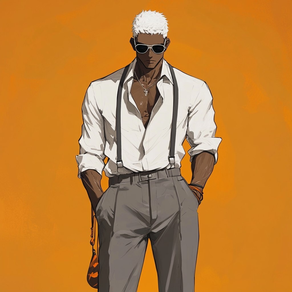 Создано на основе запроса: Dark skinned Kurono from Fire Force, tall, lean, muscular, white close-cropped hair, in white shirt, gray slacks, suspenders hanging, sandals, round rimmed sunglasses, niji 6. --- Автоперевод: Темная кожа Kurono из пожарных сил, высокие, худые, мускулистые, белые волосы с близким покрытием, в белой рубашке, серые брюки, подтяжки, сандалии, округлые солнцезащитные очки, Niji 6. Круто выглядит? 🤔 https://dzen.ru/id/65c0c65c86e4f837c27b24d7 #ИИ #AI #нейросеть #midjourney #art