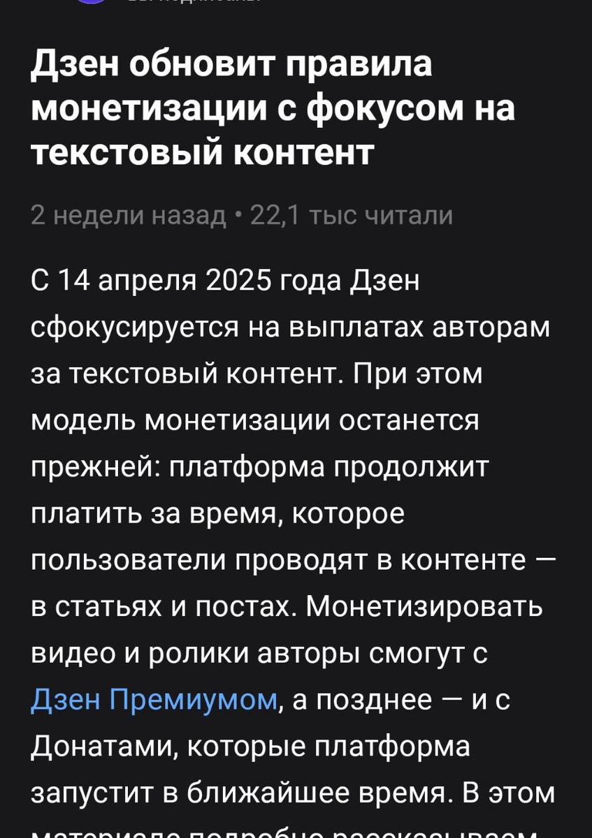 Вон, оно чё)) Короче, хотите видео в Дзене, платите... Сначала автор заплатит дзену, чтобы подключить премиум, потом подписчики заплатят за просмотр видео... А в видео теперь не должно же быть рекламы? Открыла свое последнее видео - куча рекламы. Фигня какая-то. В ближайшее время удалю видеоролики свои с этой платформы. Ютуб фореве)))