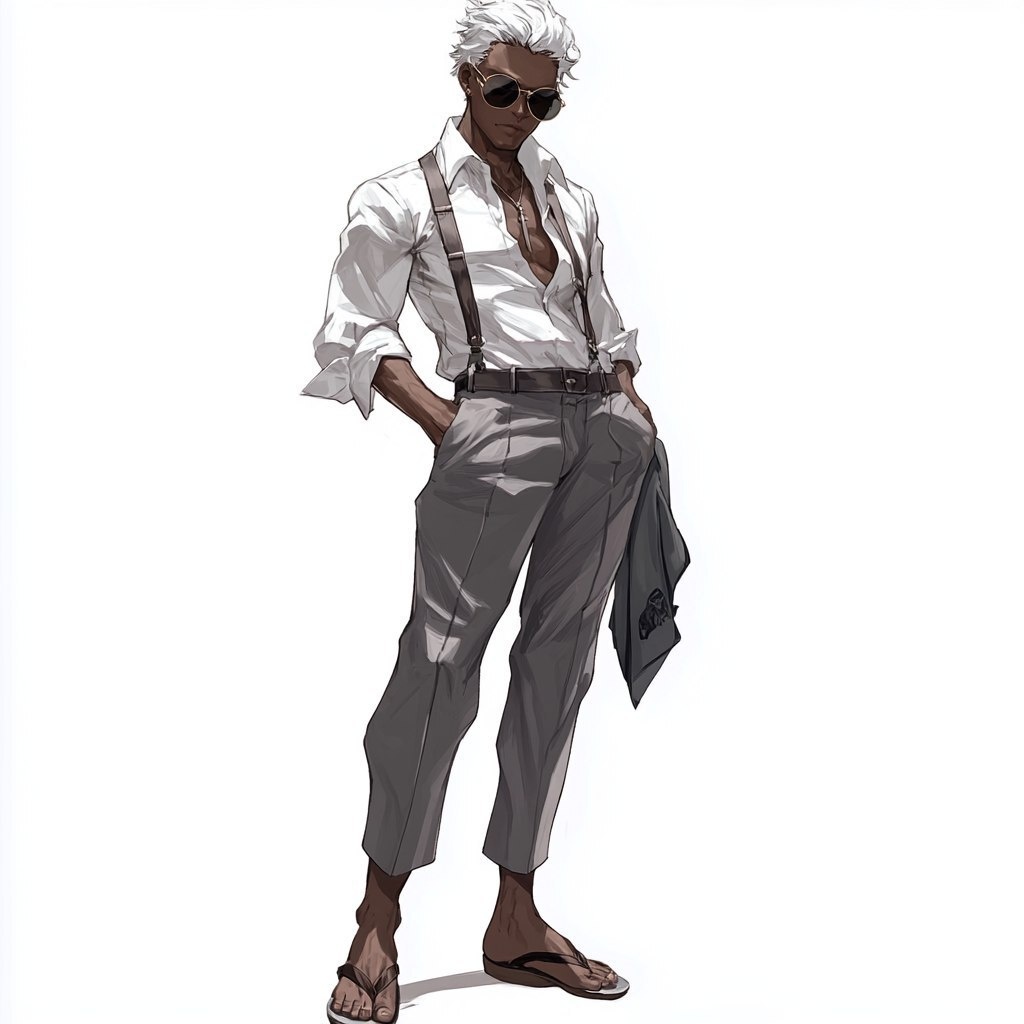 Создано на основе запроса: Dark skinned Urien, tall, lean, muscular, white close-cropped hair, in white shirt, gray slacks, suspenders