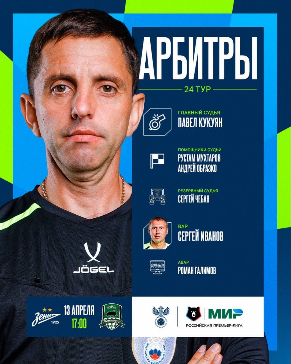 Лучший Арбитр 24-го тура🔥 🥇Павел Кукуян 8,5 🥈Егор Егоров 8,4 🥉Владимир Москалёв 8,3