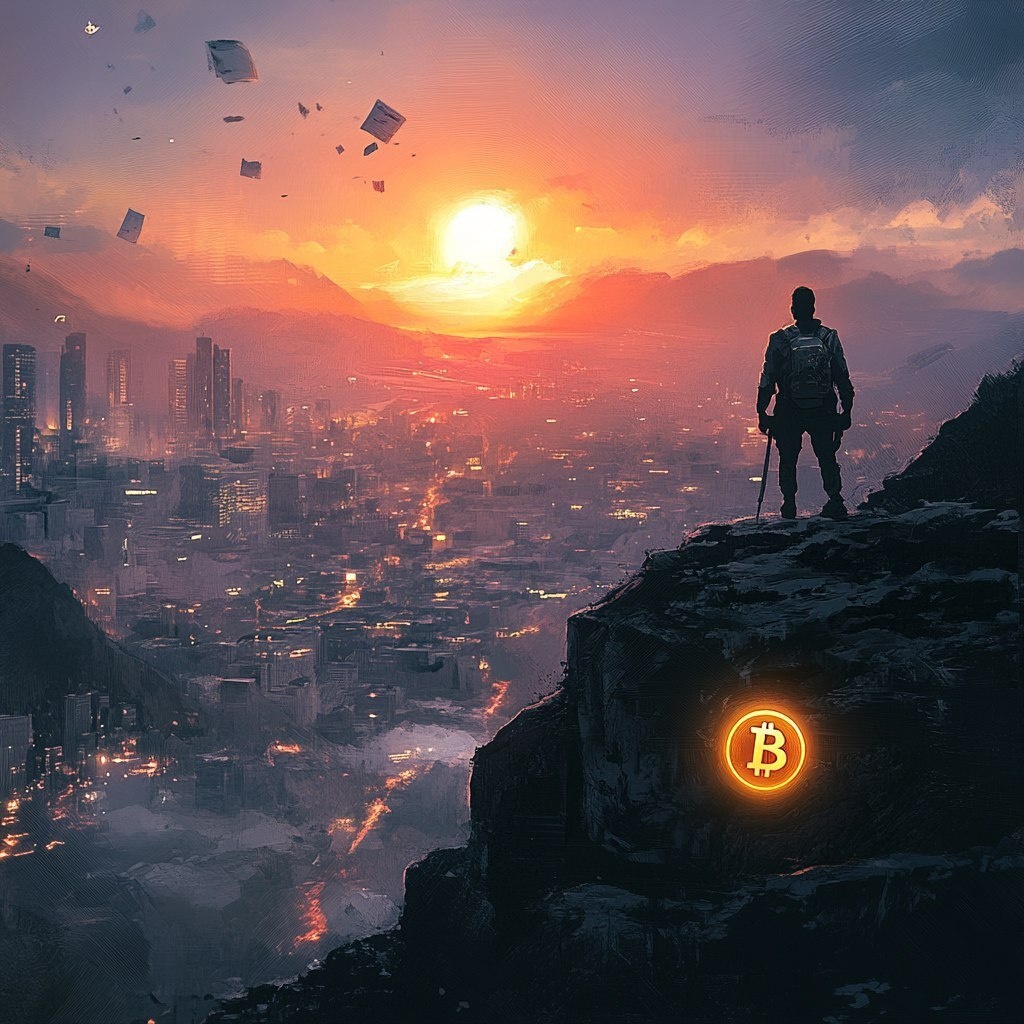 Создано на основе запроса: A lone figure stands on a rocky ledge at sunrise, overlooking a futuristic city in the valley below. In one hand, they hold a glowing Bitcoin emblem --- Автоперевод: Одинокая фигура стоит на скалистом выступе на рассвете, с видом на футуристический город в долине внизу. Круто получилось? 🤔 https://dzen.ru/id/65c0c65c86e4f837c27b24d7 #ИИ #AI #нейросеть #midjourney #art
