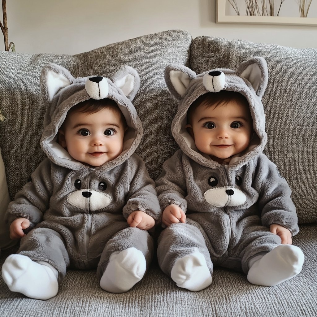 Создано на основе запроса: photo of two cute babies wearing cute wolf onesie costumes