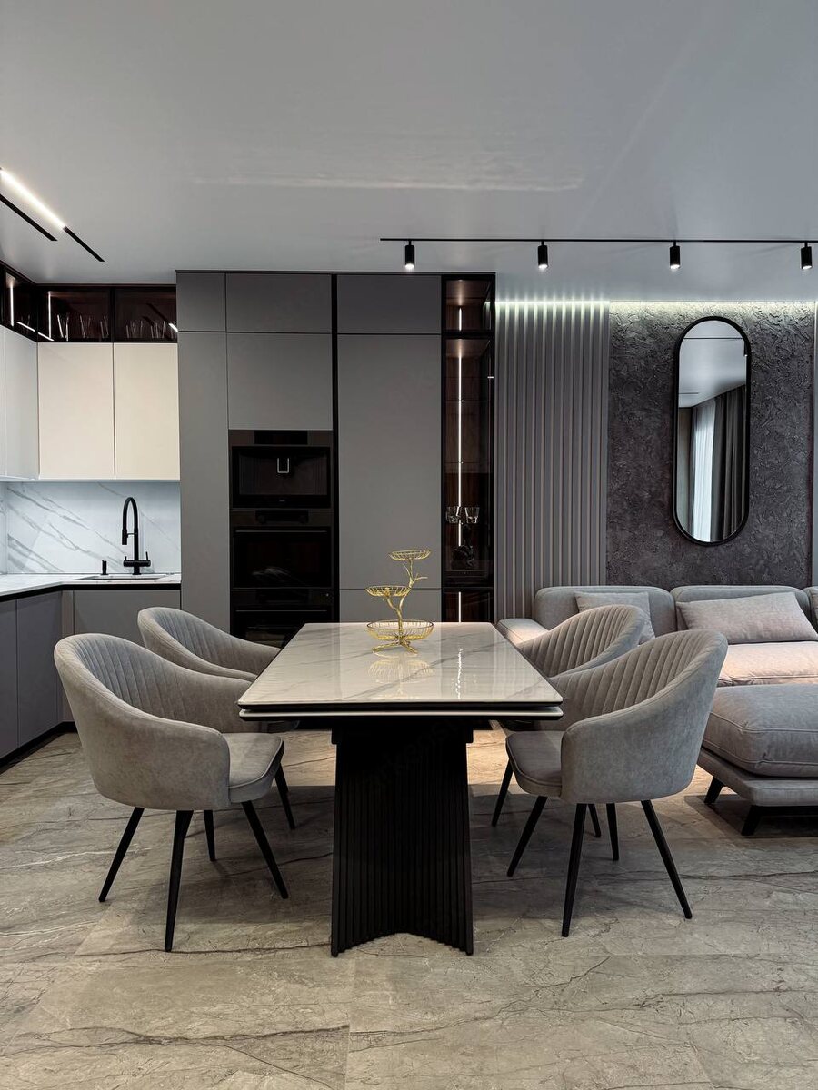 Представляем вам просторную и стильную кухню-гостиную площадью 32 кв.м. в ЖК «Вестердам» Здесь гармонично сочетаются функциональность и элегантность. Продуманное зонирование позволяет комфортно разместить как обеденную зону для семейных ужинов, так и уютную зону отдыха для расслабления. Благородные серые оттенки в сочетании с натуральным шпоном создают невероятно бархатистый и изысканный интерьер. Кухня, выполненная в потолок со столешницей из искусственного камня, добавляет пространству современности и функциональности. Удобство управления шторами обеспечивают электрокарнизы. Доверьте свой ремонт профессионалам и получите результат, который превзойдет ваши ожидания!
