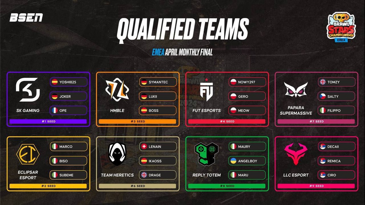 🔊 Команды, прошедшие на ежемесячный финал в EMEA Всего отобралось 8 команд, среди них Reply Totem, SK Gaming, HMBLE, FUT Esports и другие. Мир Supercell. Подписаться