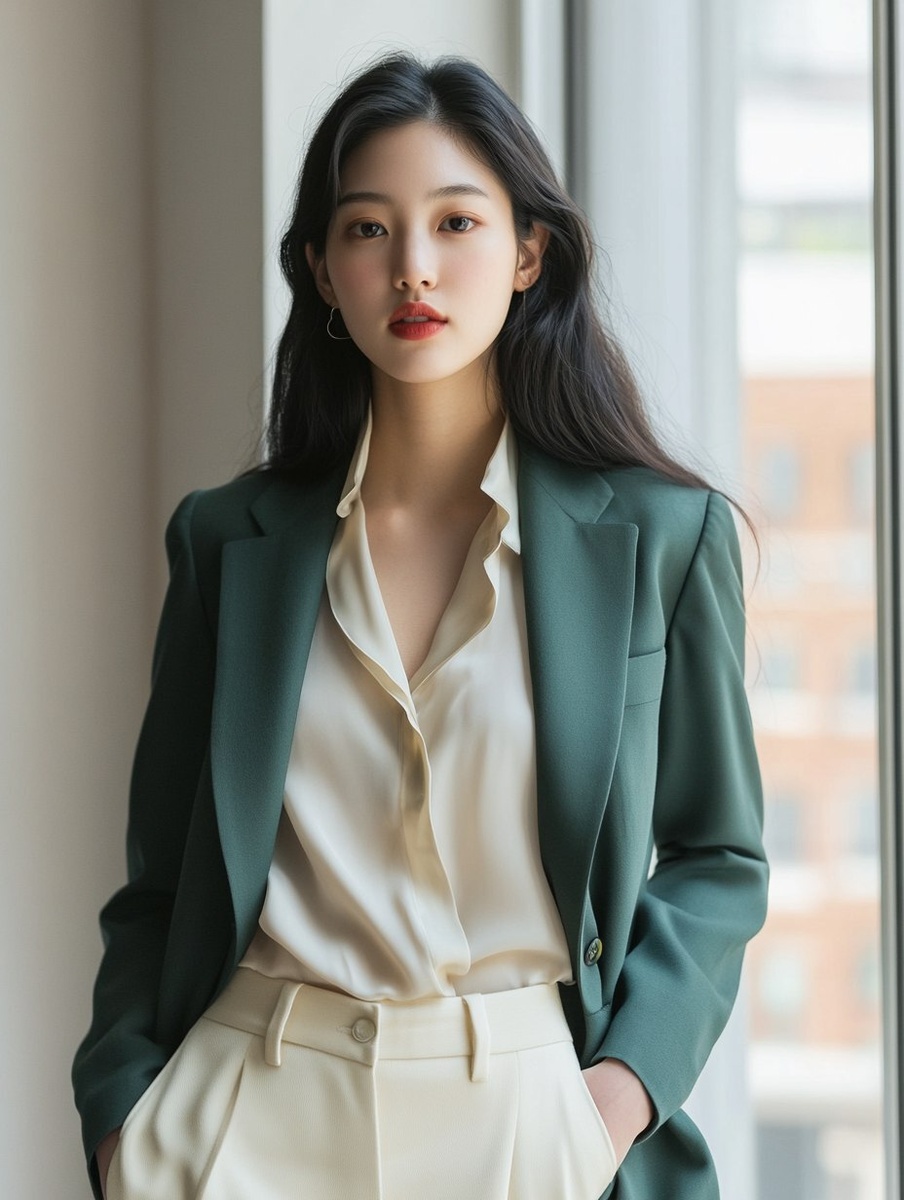 Создано на основе запроса: elegant young Asian woman in sage green blazer and cream silk blouse, tailored cream trousers, standing by modern