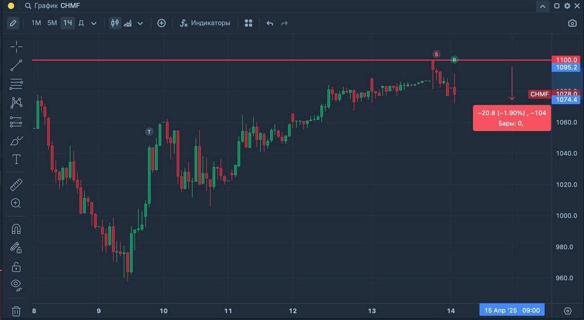 👉 С открытия рынка все инструменты пошли в коррекцию, а это именно то, что писал выше. Открытие с большим гэпом, на слабом закрытии пятницы. Поэтому сегодня логичнее и эффективнее было смотреть шорт. Шорт можно было смотреть, как с условного открытия, так и на задерге. Задерга до 2900 Мы не получили, но получили коррекцию от 2880, а значит план отработан. В Базе мы еще вчера заходили в шорт от сильного сопротивления по бумаге, вот какой итог: $CHMF 💪 Шорт от сильного уровня сопротивления 1100. Итог +1,9%. Вход на выходной сессии Т, поэтому небольшим объемом. На данный момент сейчас заходить в шорт будет не верным решением, ибо они сходили.
