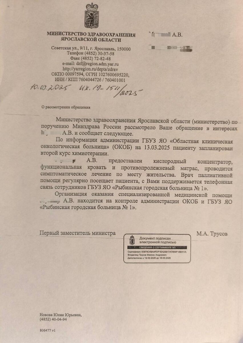 Помогла добиться лечения для онкобольного жителя Рыбинска ⬇️Ко мне в полном отчаянии обратилась супруга мужчины. Она пояснила, что в стационар ее мужа с раком почки второй стадии и метастазами в мозгу и легких не кладут. Ей приходится везти лежачего супруга в соседний город за свой счет. Каждая такая поездка обходится в 20 тысяч рублей. При этом у них многодетная семья, младшему ребенку всего пять месяцев. ✔️После моего обращения Министерством здравоохранения Ярославской области по поручению Минздрава РФ для Алексея была организована специализированная помощь и назначен курс химиотерапии. Помимо этого, его начал навещать на дому врач паллиативной помощи. Благодарю Минздрав Ярославской области за помощь и неравнодушие! Алексею желаю скорейшего выздоровления🙏 📩Рассказать мне о проблеме можно также через онлайн-приемную Государственной Думы. 🔵Подписаться на Телеграм 💙Подписаться на ВК #ЯнаЛантратоваПоможет