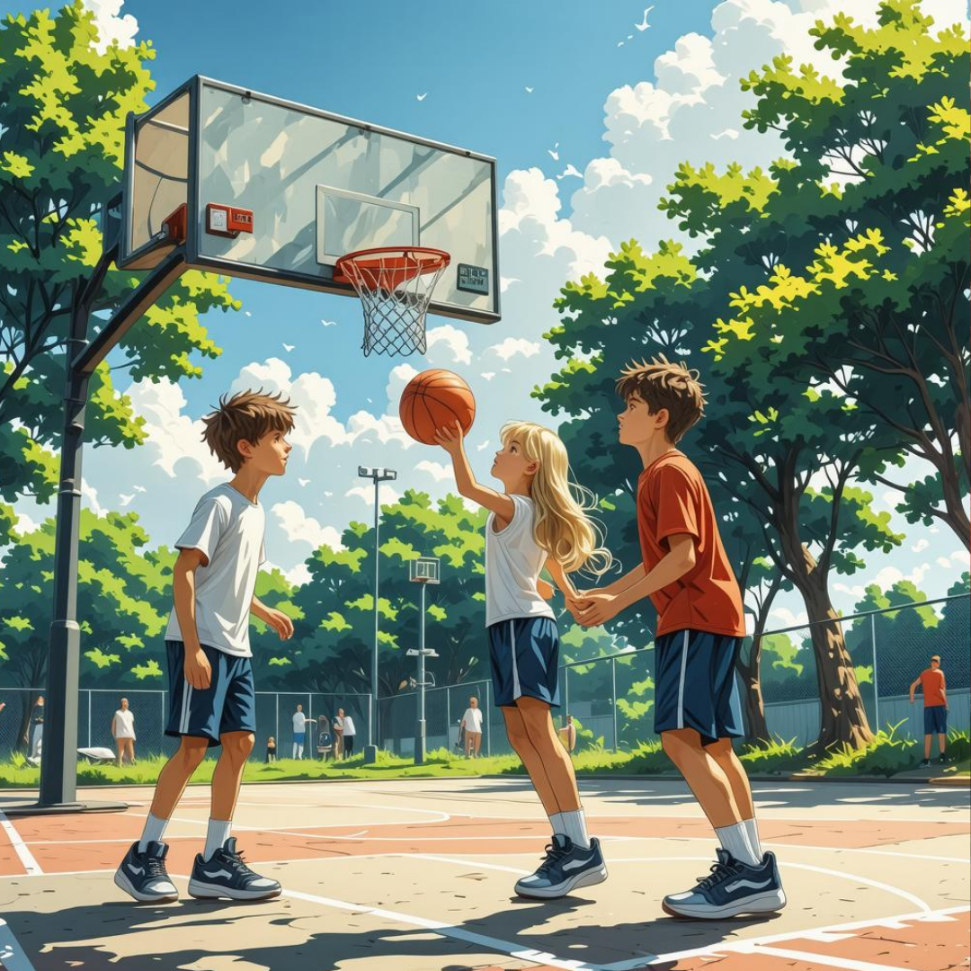 Друзья пошли на старую баскетбольную площадку, которая была рядом с парком. На их удачу, площадка была свободна, и они стали по очереди бросать мяч в корзину, попутно разговаривая на разные темы, подшучивая друг над другом, когда кто-то промахивался.